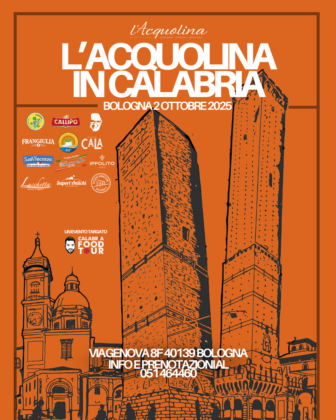Il 2 ottobre a Bologna, il ristorante L’Acquolina ospita una cena speciale dedicata ai sapori calabresi con prodotti tipici e vini d’eccellenza.