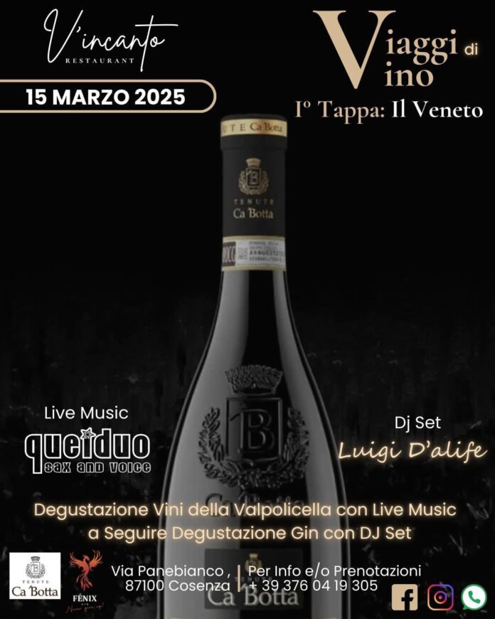 Si chiama “Viaggi di vino” il nuovo format proposto al pubblico da “V’incanto Restaurant” a Cosenza che diventa laboratorio di assaggi enologici abbinati alla buona cucina mediterranea e alla musica di qualità.